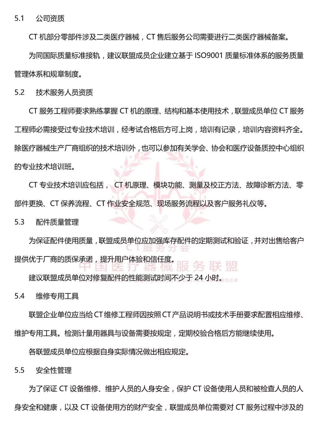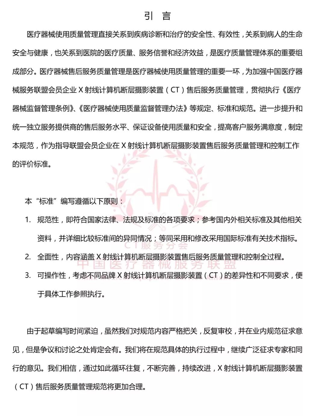 醫療器械售后服務質量管理是醫療器械使用質量管理的重要一環,為加強e中國醫療器械服務聯盟會員企業X射線計算機斷層攝影裝置(CT)售后服務質量管理,貫徹執行《醫療器械監督管理條例》、《醫療器械使用質量監督管理辦法》等規定、標準和規范,進一步提升和統一獨立服務提供商的售后服務水平、保證設備使用質量和安全,提高客戶服務滿意度,制定本規范,作為指導聯盟會員企業在X射線計算機斷層攝影裝置售后服務質量管理和控制工作的評價標準。